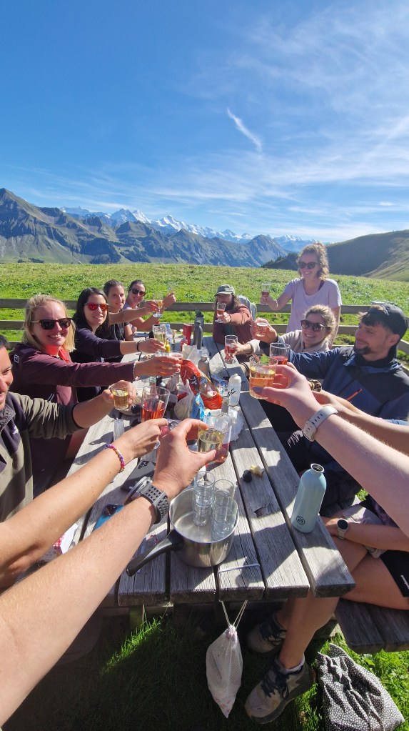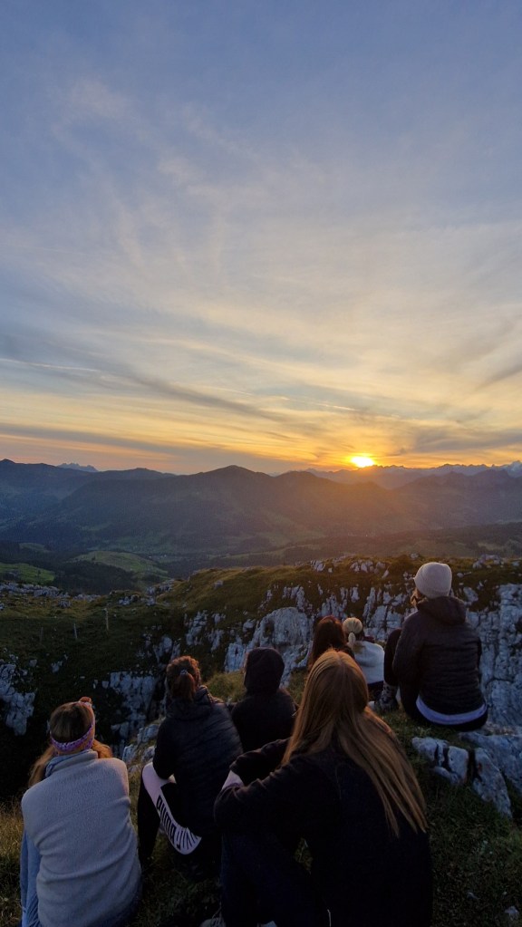 Sommerliche Temperaturen, Apero auf der Terrasse, Sonnenuntergang auf dem Schibegütsch, Vollmond (voller geht kaum), Leckerstes Risotto der Welt mit viiel Reibkäse, Sonnenaufgang auf dem Böli, (Geburtstags)Bad im Brunnen und Wanderung zum Hengst.